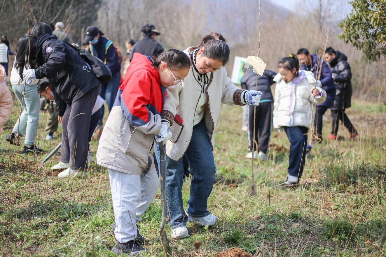 随后,亲子家庭领取了树苗和植树工具,前往指定的植树区域。在专业园艺师的指导下,大家学习了树种的选择、种植技巧及后续养护方法。在家长的协助下,孩子们积极参与挖坑、植树的过程,现场洋溢着劳动带来的欢乐与满足。植树结束后,每个家庭还为自己的小树苗挂上了写满美好愿望的许愿牌,寄托了对未来绿色生活的向往。