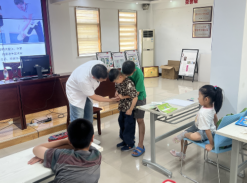 活动伊始,浦口中心医院的医师李小龙用通俗易懂的语言向孩子们介绍了海姆立克急救法的原理和重要性。通过“石头剪刀布”口诀(肚脐上两指为“石头”,另一手握拳为“剪刀”,快速向上冲击为“布”),将复杂的急救步骤转化为简单易记的动作,迅速吸引了孩子们的注意力。