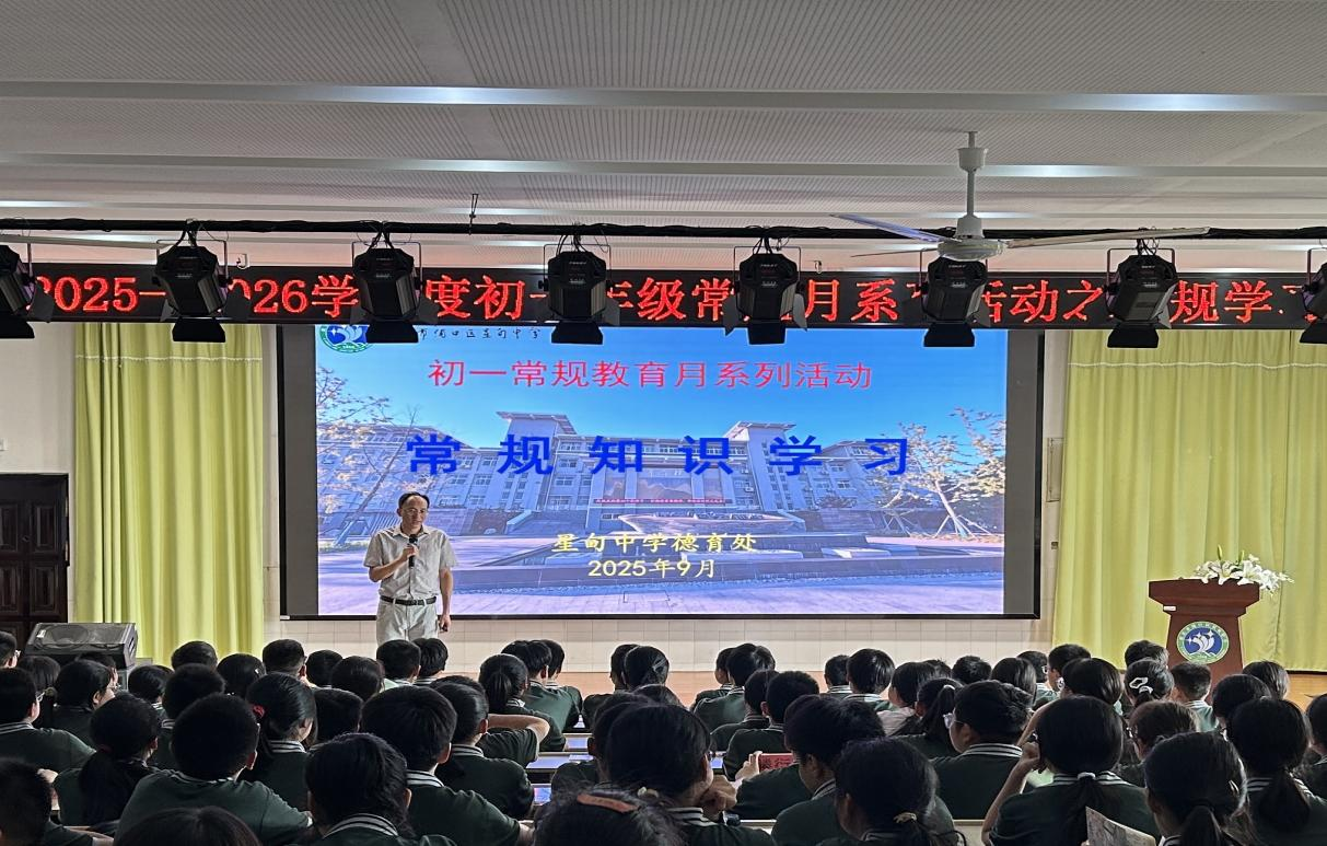 活动伊始,德育处蒋主任为全体初一学生开设了“常规知识讲座”,围绕《星甸中学学生一日常规》展开系统讲解。蒋主任从“为何学”“学什么”“怎么学”三个维度深入剖析,结合生动案例,强调规范不仅是纪律的约束,更是成长的阶梯。同学们凝神聆听,积极互动,在润物无声中筑牢行为之基,明晰成长方向。